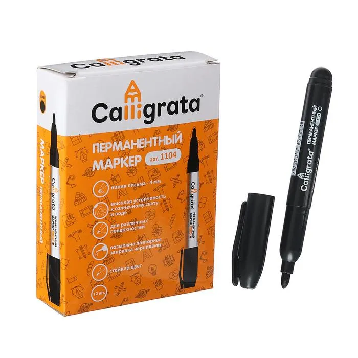 Можно маркировать, среди прочего, пластмассовые, деревянные, металлические, стеклянные или картонные предметы.Цвет колпачка соответствует цвету чернил.Фетровый, круглый, эластичный наконечник обладает повышенной износостойкостью и обеспечивает экономный расход чернил.Отличается продленной линией письма.Изделие не перезаправляется.Плотно закрывается колпачком, что предотвращает высыхание наконечника и чернил.Толщина линии письма 1 - 4 мм в зависимости от угла наклона.Спиртовая основа быстросохнущих чернил.Круглая форма корпуса из пластика.Перманентный маркер Calligrata должен быть всегда под рукой!