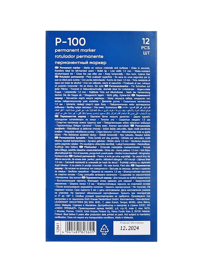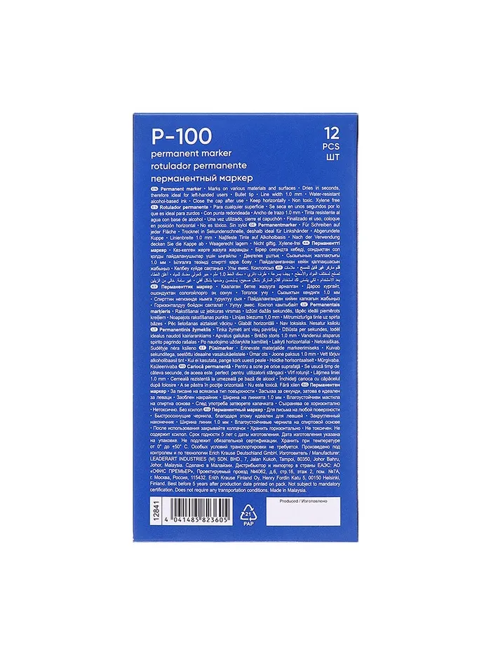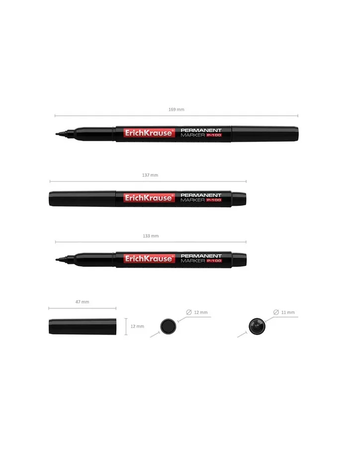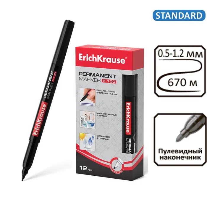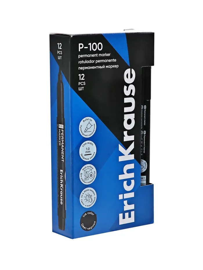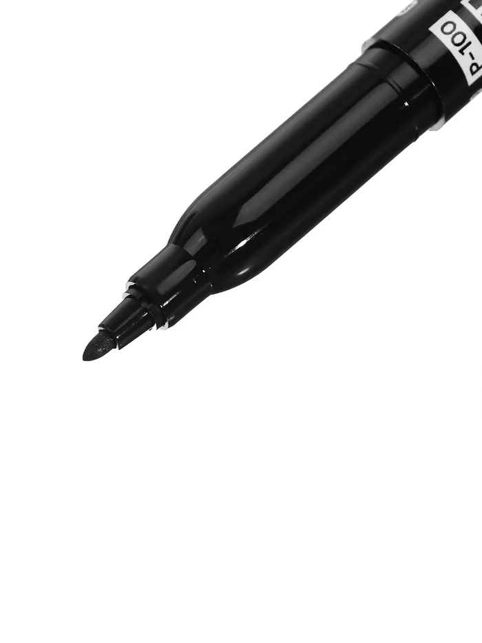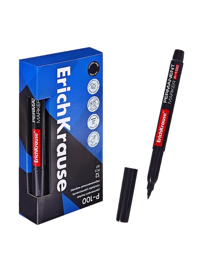 Универсальный тонкий перманентный маркер. Предназначен для письма и маркировки практически на всех поверхностях: бумага, картон, стекло, пластик, фарфор, керамика, дерево и др. Имеет круглую форму корпуса и цветной колпачок. Цвет колпачка и заглушки соответствует цвету чернил. Наконечник пулевидной формы, устойчивый к повреждению и истиранию. Толщина линии письма – 0.5-1.2 мм. Чернила на спиртовой основе, водоcтойкие, светостойкие, стойкие к ультрафиолетовым лучам, быстро высыхают после нанесения. Нетоксичные. Не содержат ксилол, толуол. Срок годности 5 лет.