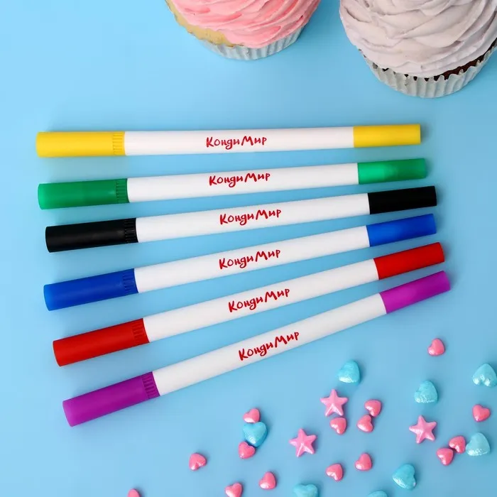 Набор пищевых маркеров двусторонних - это отличная идея для кондитерского декора на любой праздник Фломастеры имеют особую форму и текстуру, что обеспечивает легкость работы и точность линий. Уникальный стержень позволяет имитировать мазки киски. За счет мягкого наконечника кисти фломастеры идеально подходят для росписи плотных поверхностей, позволяют делать тонкие, а также толстые линии и различные узоры.