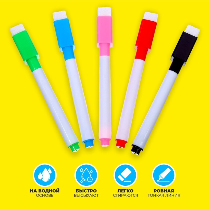 Находитесь в поиске маркеров для учебных или деловых презентаций на белой эмалевой доске? Маркер с магнитом цветной, на водной основе, набор 5 шт. – подходящий выбор для самых успешных презентаций. Этот вариант включает в себя все достоинства обычных маркеров для досок – насыщенный цвет, ровную яркую линию, светоустойчивость. Однако водная основа имеет свои особые преимущества.