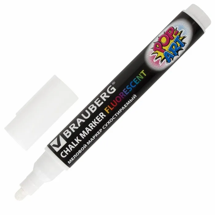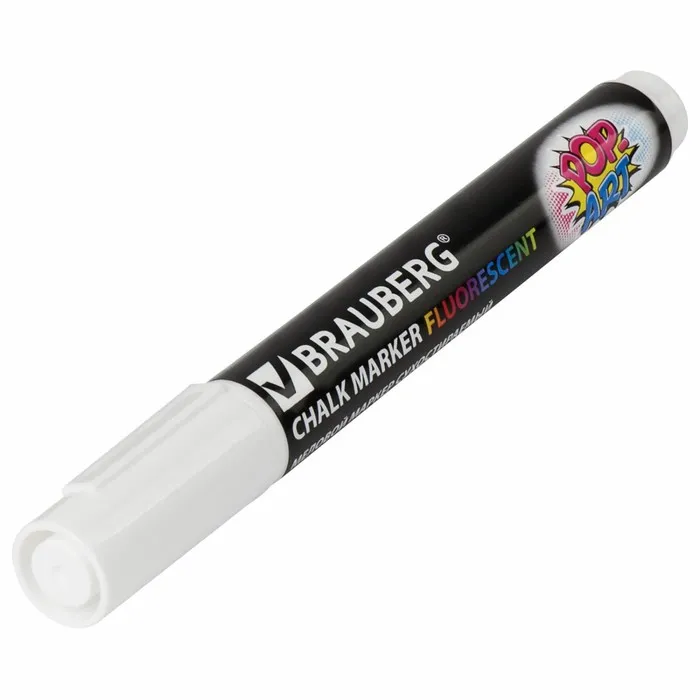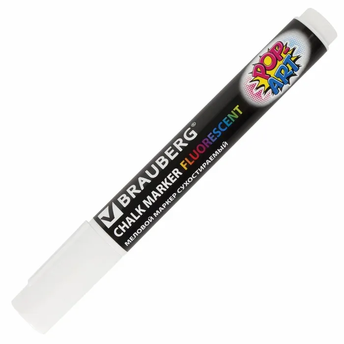 Маркер BRAUBERG "POP-ART" — это сухостираемый меловой маркер, предназначенный для использования на гладких поверхностях, таких как стекло и белые доски, позволяет создавать четкие линии. Флуоресцентный белый цвет делает его заметным и привлекательным для различных приложений, включая оформление, презентации и обучение. Маркер легко стирается с поверхности, что позволяет многократно использовать его без остаточной записи.