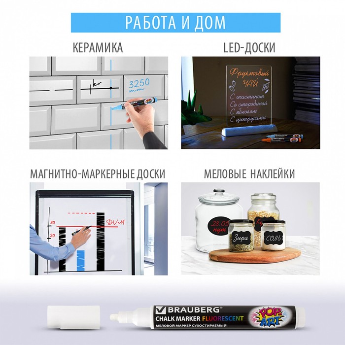 Маркер BRAUBERG "POP-ART" — это сухостираемый меловой маркер, предназначенный для использования на гладких поверхностях, таких как стекло и белые доски, позволяет создавать четкие линии. Флуоресцентный белый цвет делает его заметным и привлекательным для различных приложений, включая оформление, презентации и обучение. Маркер легко стирается с поверхности, что позволяет многократно использовать его без остаточной записи.