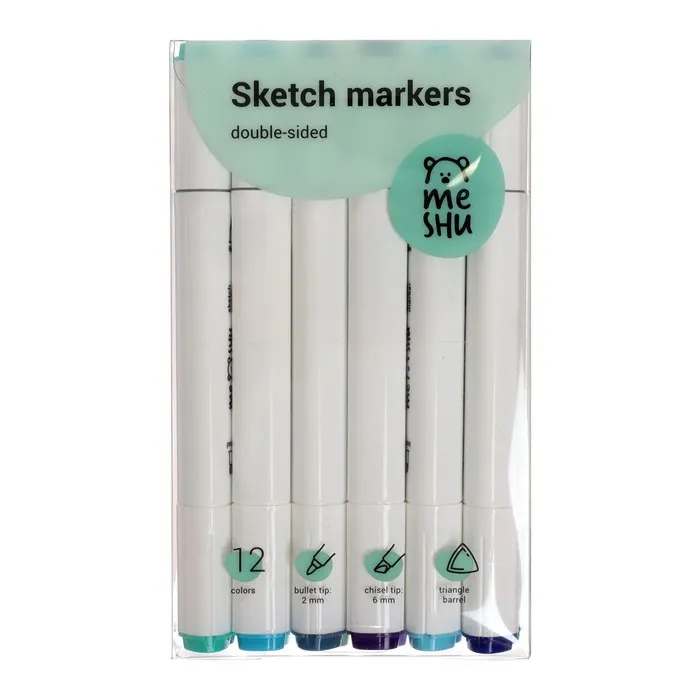 Набор двусторонних маркеров для скетчинга Meshu - идеальный выбор для художников, дизайнеров, иллюстраторов и любителей скетчинга, подходят для создания анимэ и манги. Эргономичный трехгранный корпус удобно лежит в руке и позволяет эффективно прорабатывать мелкие детали рисунка. Чернила на спиртовой основе - быстро высыхают, водостойкие, нетоксичны и не портят поверхность бумаги. Маркеры обладают пулевидным (2 мм) и скошенным (6 мм) наконечниками, что позволяет прорабатывать как мелкие детали рисунка. так и закрашивать большие области.