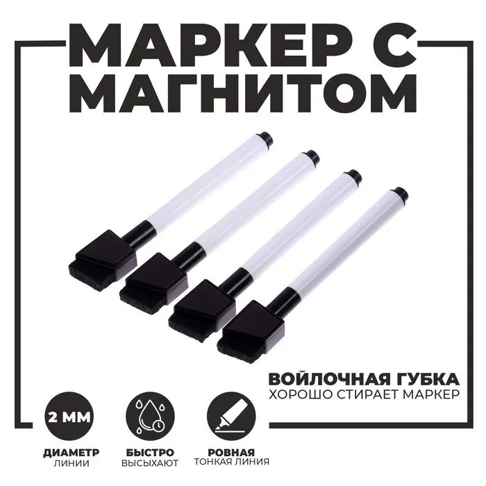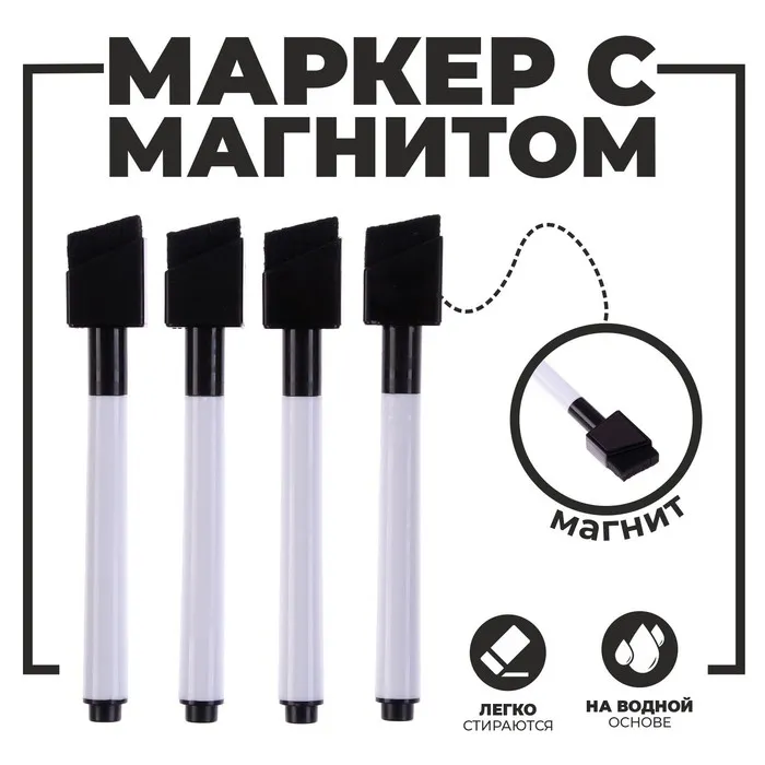 Маркеры на водной основе со стиралкой и магнитом, набор — 4 шт., цвет чёрный — Характеристики
