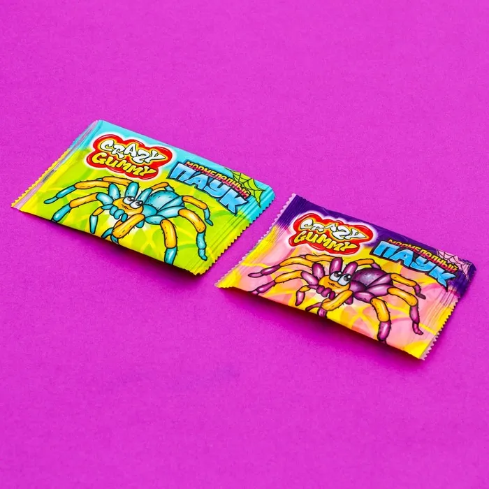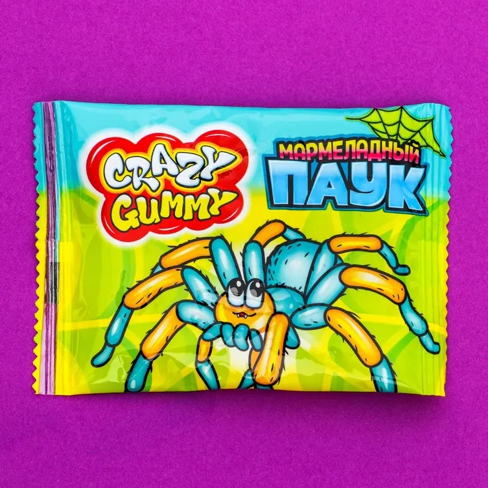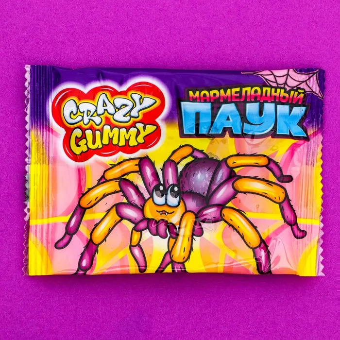 Фруктовый жевательный мармелад с натуральным соком в форме пауков. Мармелад без вредных компонентов; искусственных красителей; ароматизаторов. Мармелад содержит полностью натуральные компоненты позволяют создать отличные вкусовые качества и не вредят организму.