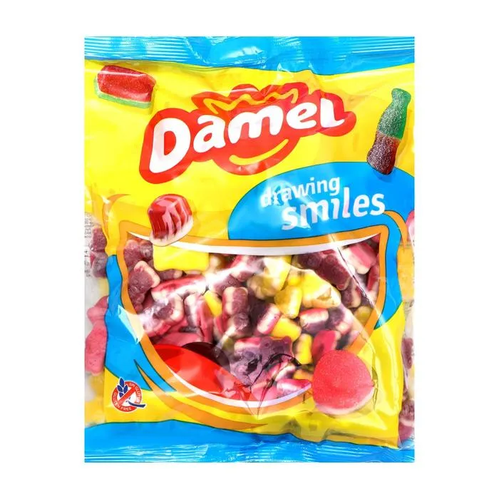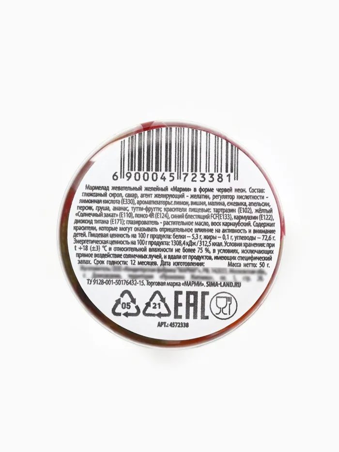 Состав: сахар-песок, патока карамельная, желирующий агент: желатин, натуральный сок яблочный, регулятор кислотности: лимонная кислота, влагоудерживающий агент: сорбитовый сироп, ароматизаторы: апельсин, абрикос, груша, клюква, малина, дыня, глазирователь: растительное масло, каранаубский воск, консервант: сорбиновая кислота, красители искусственные: «Понсо 4R», «Хинолиновый желтый», «Зеленый горошек», «Красный мак», желтый «Солнечный закат» FCF.