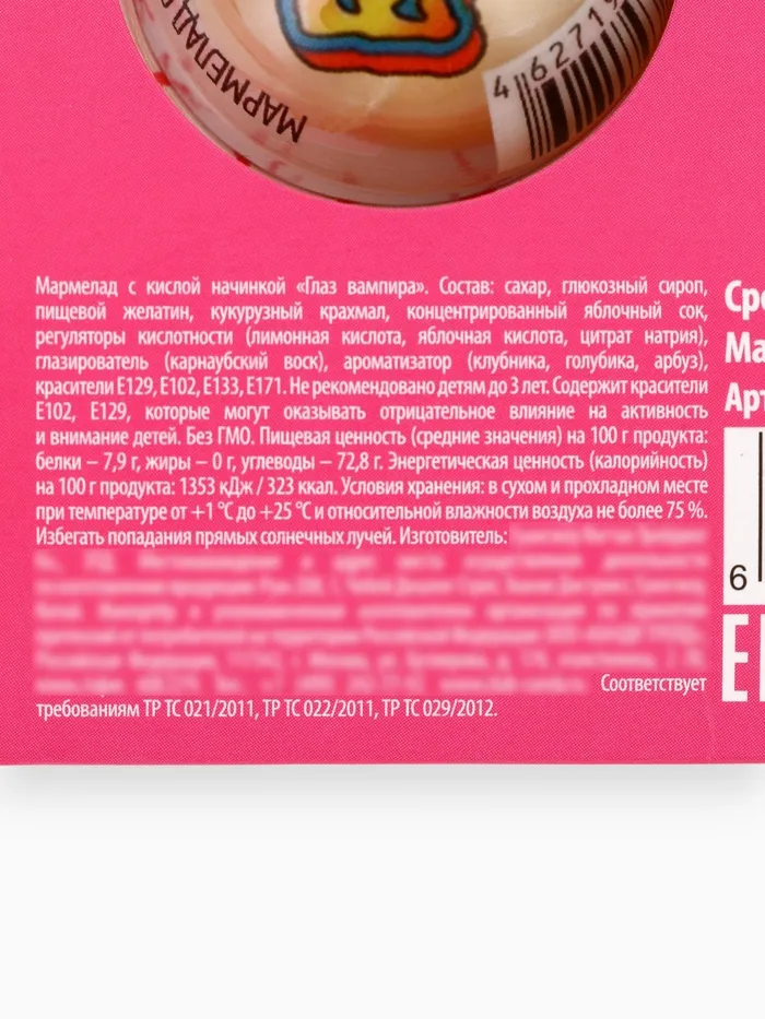 Состав: сахар, глюкозный сироп, пищевой желатин, кукурузный крахмал, концентрированный яблочный сок, регулятор кислотности (лимонная кислота, яблочная кислота, цитрат натрия), глазирователь (карнаубский воск), ароматизатор (клубника, голубика, арбуз), красители Е129, Е102, Е133, Е171.