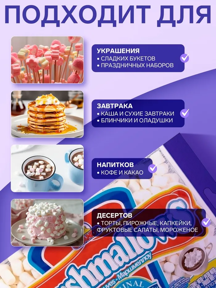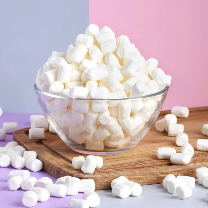 Классический мягкий ванильный маршмеллоу, представленный в мини-кусочках. Мини-маршмеллоу можно добавлять в горячий шоколад, какао, кофе, коктейли, мороженное. Растворяясь в напитках, маршмеллоу превращается в нежное ванильное облако! Этот вид маршмеллоу также используется для приготовления мастики и кондитерских украшений или как топпинг.
