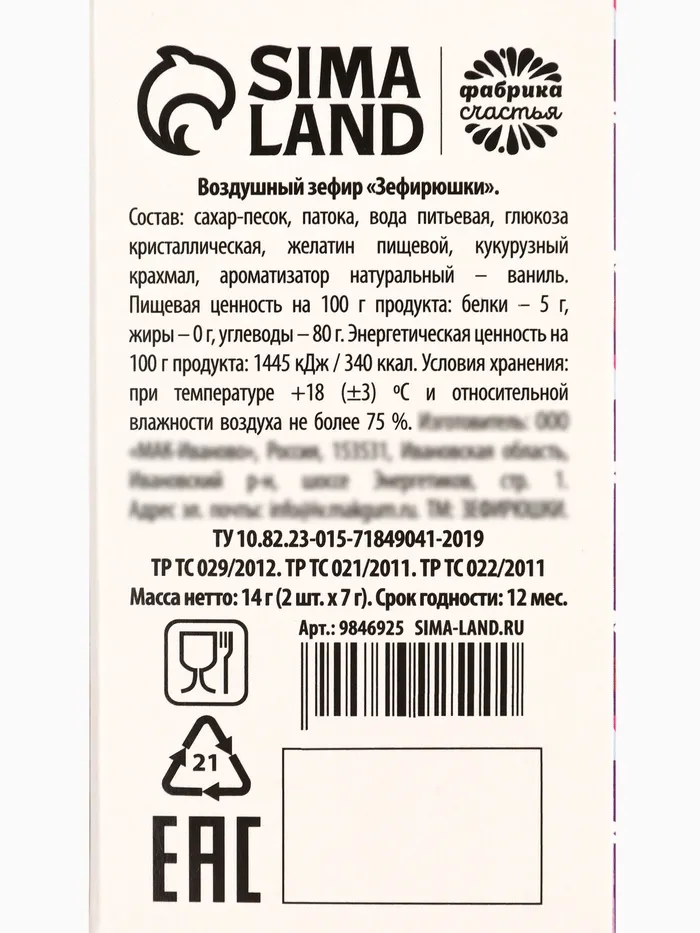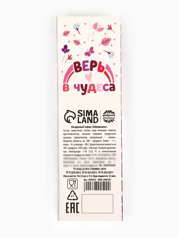 Состав: глюкозный сироп, сахар, желатин пищевой, кукурузный крахмал, регулятор кислотности (цитрат натрия), консервант (сорбат калия), ароматизаторы (клубника, ваниль), красители E102, Е110, Е129, E133.