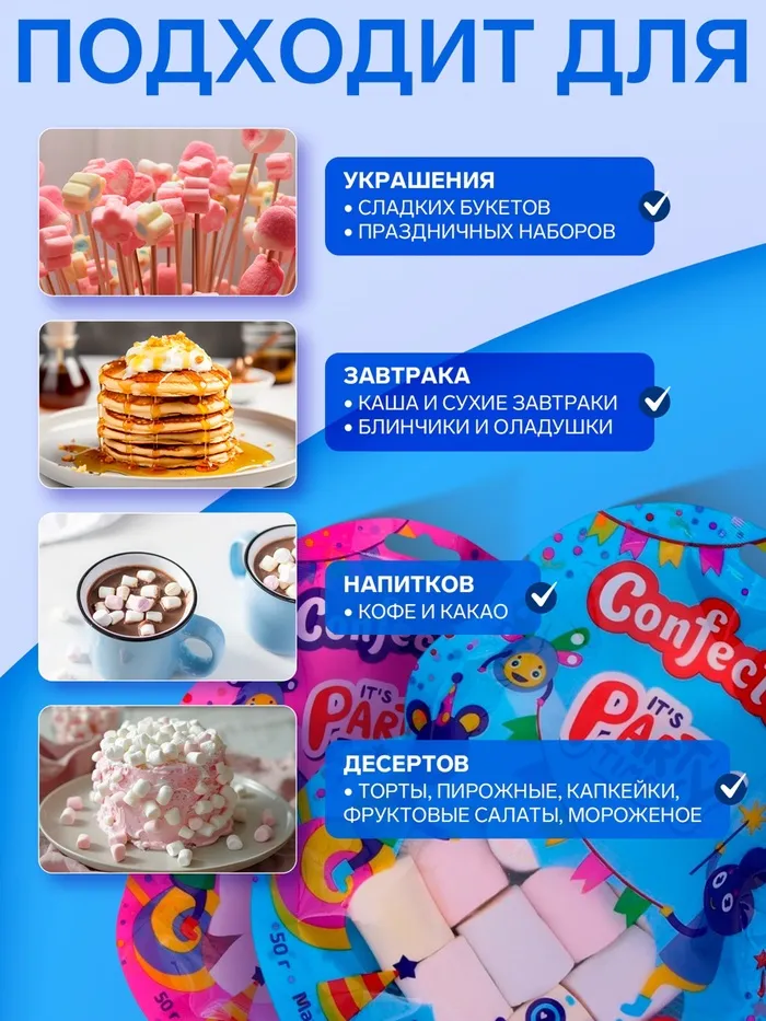 Каждый кусочек мягкого и воздушного маршмеллоу обладает насыщенным вкусом. Яркие цвета делают этот десерт не только вкусным, но и визуально привлекательным, добавляя веселое настроение в ваш день.