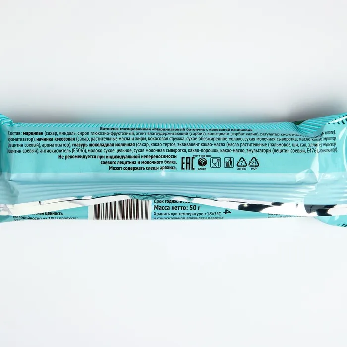 Состав: марципан (сахар, миндаль (33%), глюкозно-фруктозный сироп, влагоудерживающий агент (сорбит), консервант (сорбат калия), регулятор кислотности (лимонная кислота), ароматизатор), шоколадная молочная глазурь (сахар, какао тёртое, эквивалент какао-масла (масла растительные (пальмовое, ши, сал, эллипе), эмульгатор (соевый лецитин), антиокислитель (Е306)), сухое цельное молоко, сухая молочная сыворотка, какао порошок, какао-масло, эмульгаторы (соевый лецитин, Е476), ароматизатор), кокосовая начинка (сахар, растительные масла и жиры, кокосовая стружка, сухое обезжиренное молоко, сухая молочная сыворотка, какао-масло, эмульгатор (соевый лецитин), ароматизатор).