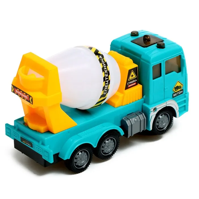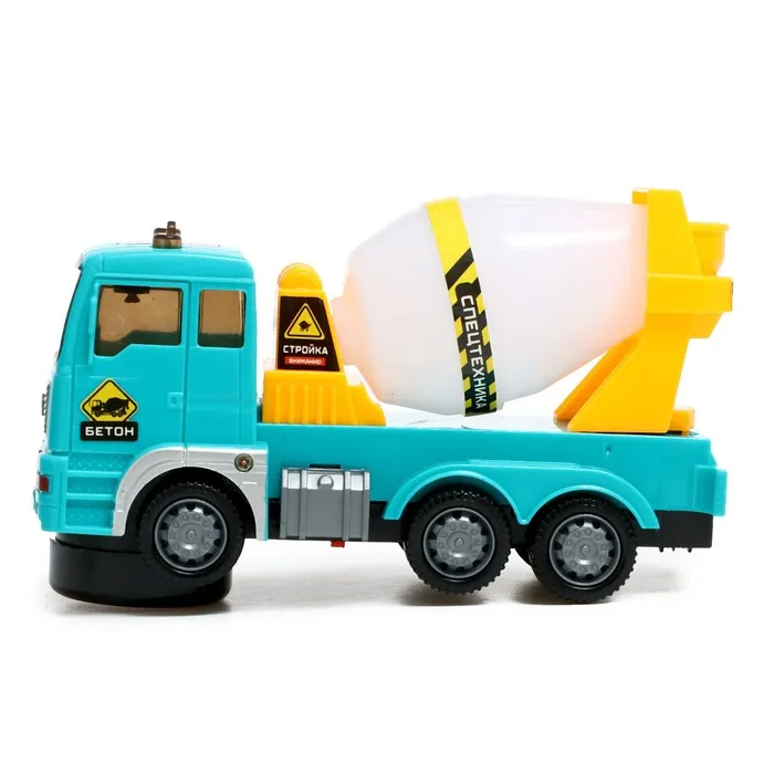 Машина «Бетон» — настоящий автобетоносмеситель, который станет незаменимым помощником при строительстве крупных и важных объектов. Этот грузовой автомобиль оборудован вращающейся ёмкостью для перевозки бетонной смеси. Малыш сможет почувствовать себя водителем спецтехники, примерить на себя роль настоящего строителя. С «Бетоном» можно играть дома и брать его с собой на прогулку. Ребёнок сможет не только увлекательно провести время за игрой, но также придумать новые сюжеты, развить свою фантазию и воображение. А яркий дизайн и проработанные детали сделают игру динамичнее и интереснее.