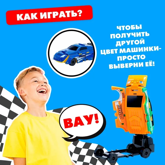 Стань гонщиком будущего с машинками, которые меняют цвет! Набор «Гонка» – это две трансформирующиеся машинки, которые перенесут тебя в мир захватывающих гонок. Просто выверни их, чтобы получить новый цвет и стиль.