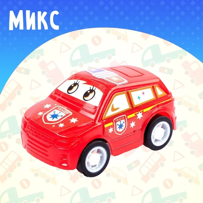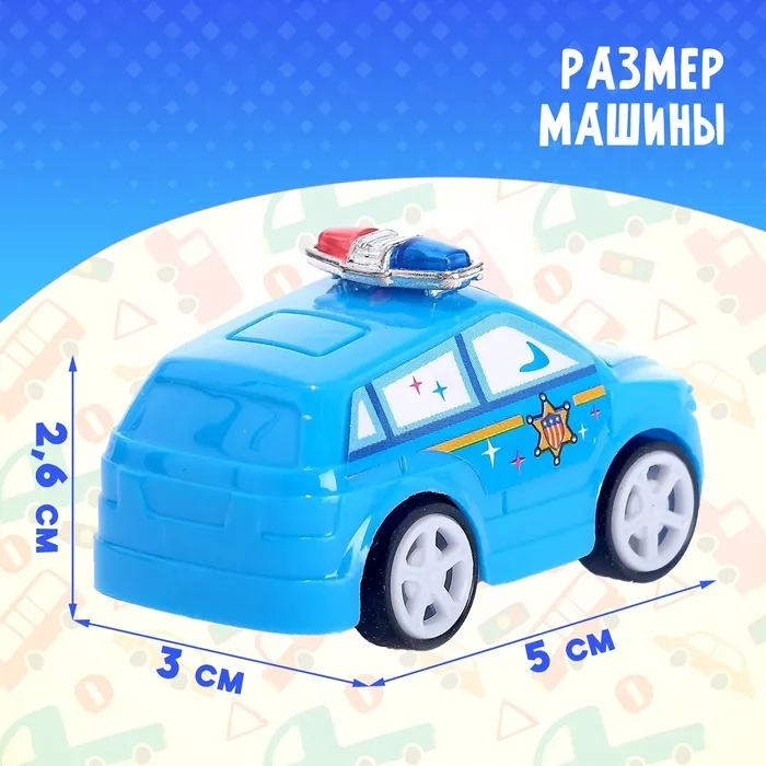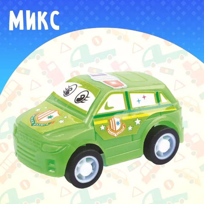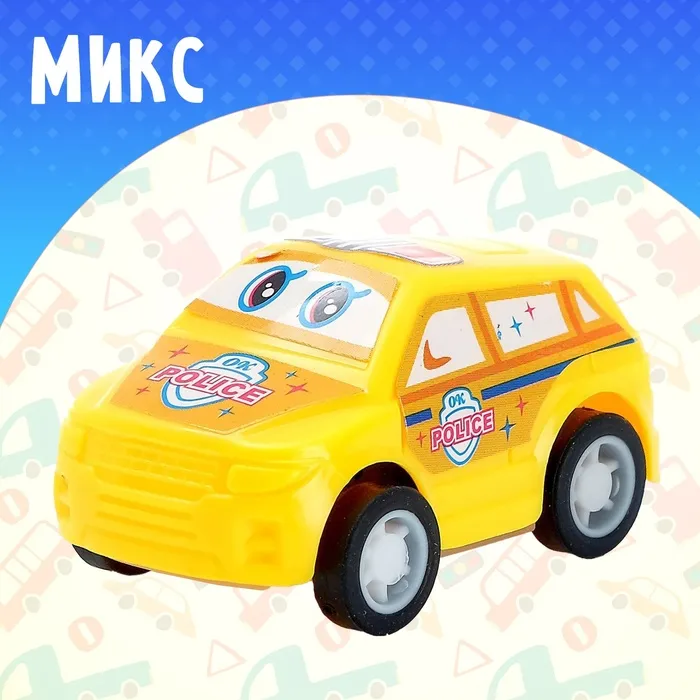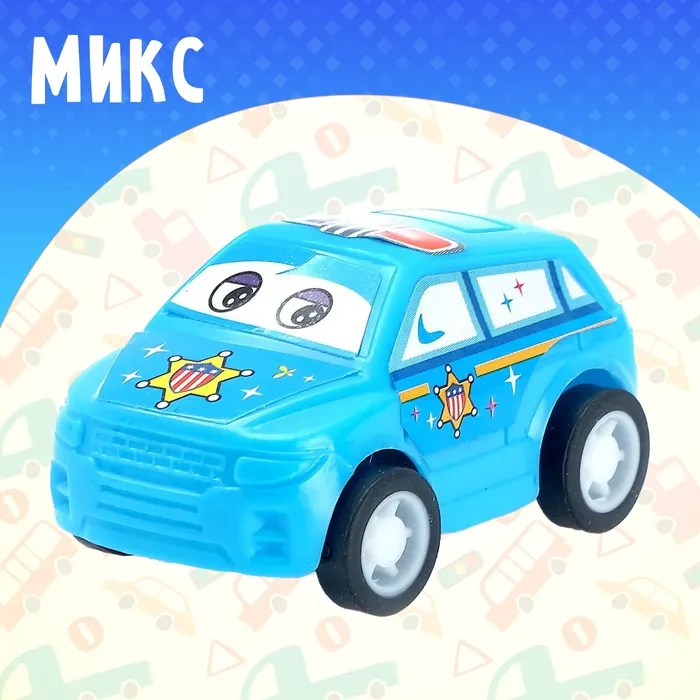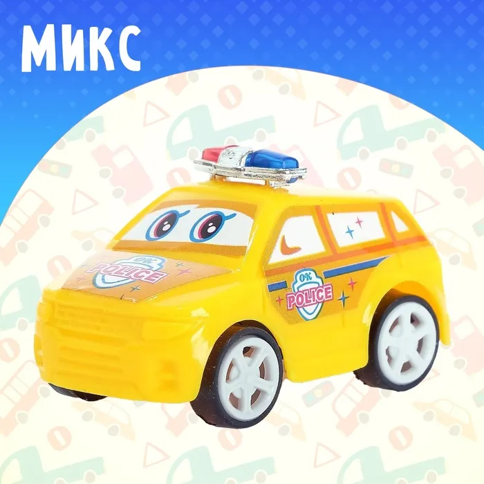 Яркая и забавная полицейская машинка с добрыми глазками станет любимцем вашего ребёнка. Автомобиль подойдёт в качестве приятного мини-сюрприза малышу или памятного подарка от именинника друзьям. Инерционный механизм приводит автомобиль в движение без батареек. Просто откатите его назад и отпустите — машинка быстро разовьёт скорость и доедет куда угодно.