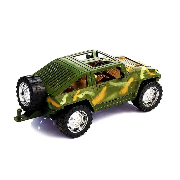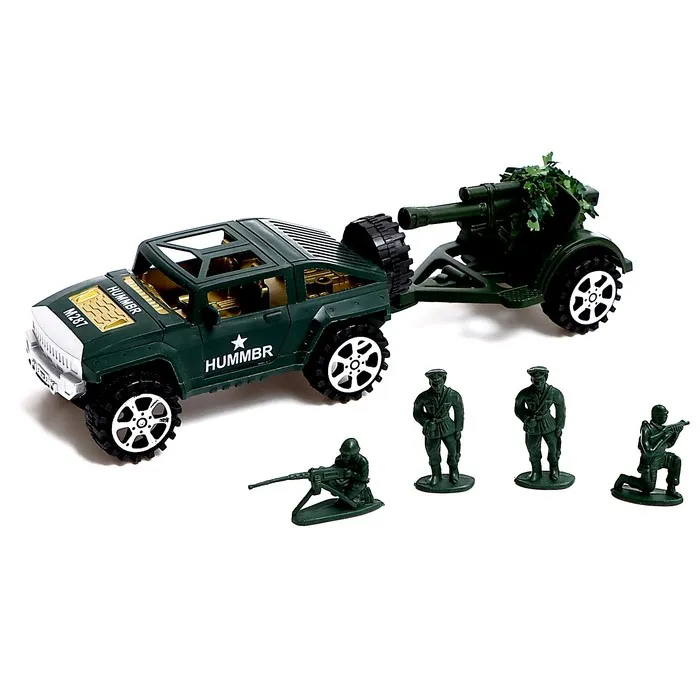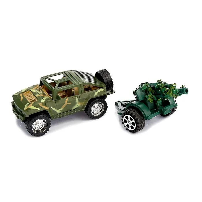 Камуфлированный джип с пушкой и военным водителем - идеальный выбор для юных любителей военной техники. Компактная модель создана для захватывающих приключений на любой поверхности.