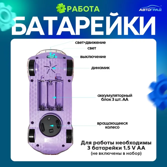 - Машинка работает от 3 батареек АА (нет в комплекте).