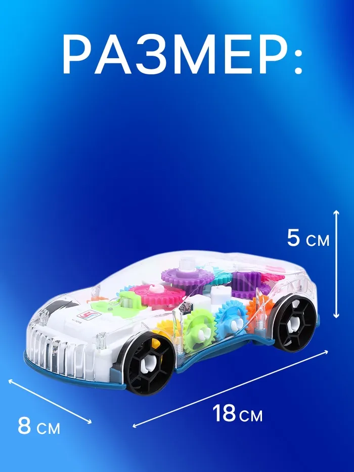 Машина «Шестерёнка» — это транспорт с прозрачным корпусом. У него внутри есть подсветка и движущиеся детали! Машинка объезжает встречающиеся препятствия и воспроизводит весёлую музыку.