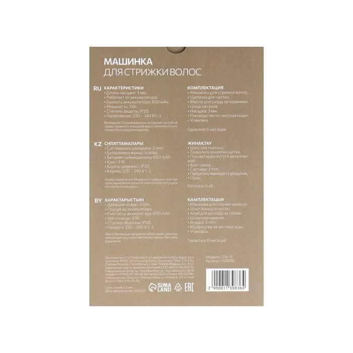 Машинка для стрижки Luazon LTRI-11, 3 Вт, 3 мм, АКБ, серая — Характеристики