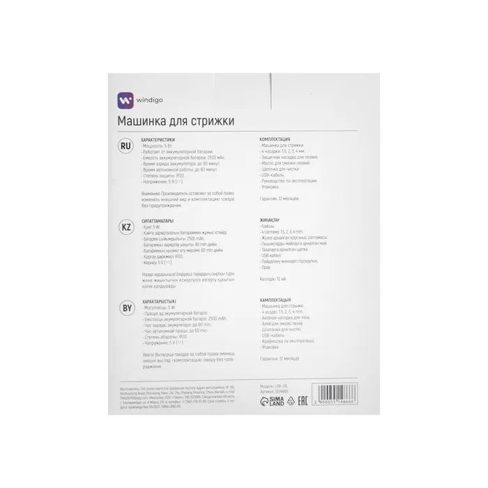 Машинка для стрижки Windigo LTRI-28 "Барбер", портативная, 2500 мАч, 1,5/2/3/4 мм, АКБ — Характеристики