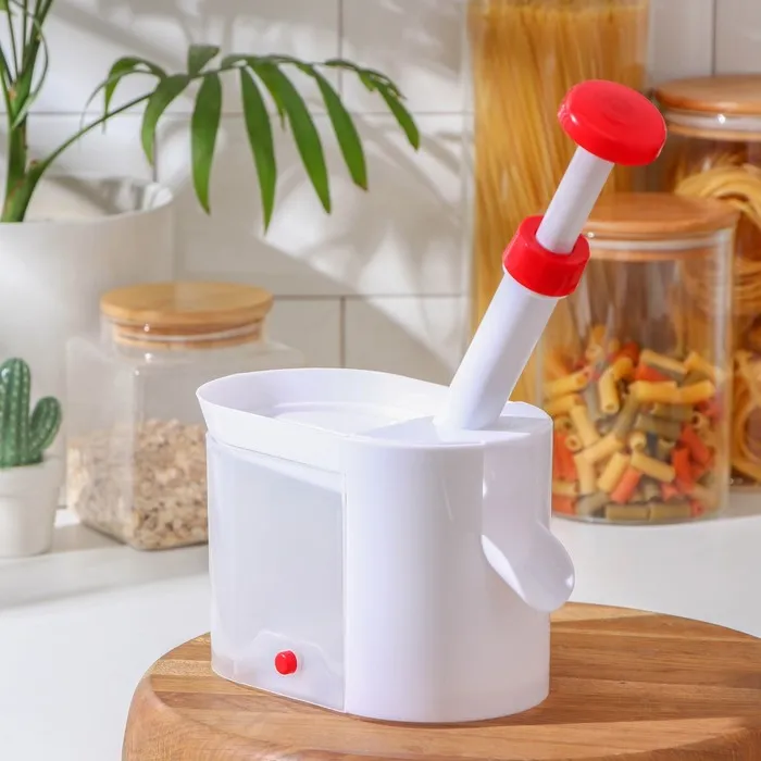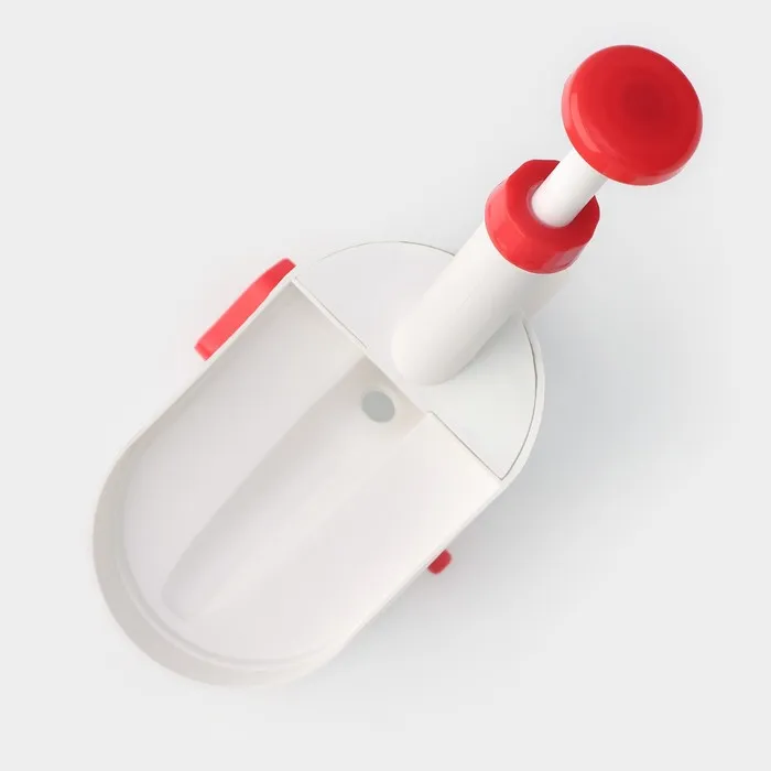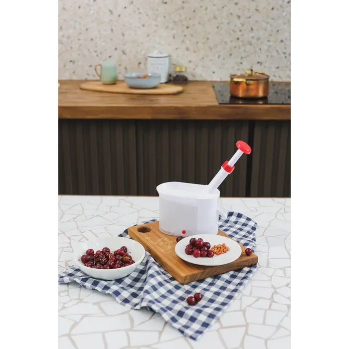 - Резиновая подложка в основании контейнера и боковой рычаг позволят устойчиво зафиксировать машинку для удаления косточек из вишен на гладкой поверхности стола.