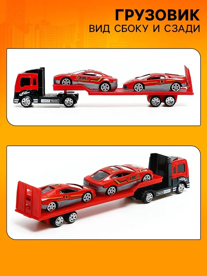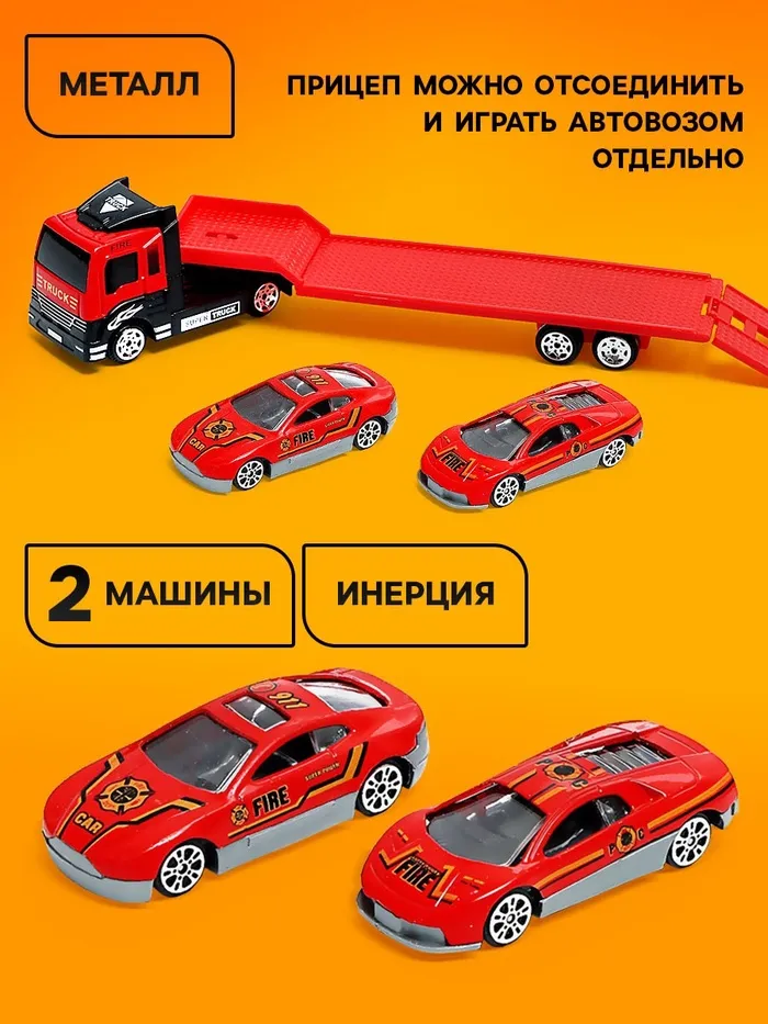 «Пожарный автовоз» — это металлический грузовик с тралом, который позволит ребёнку оказаться в роли настоящего героя. Малыш загрузит машинки на трал и отправится на помощь!