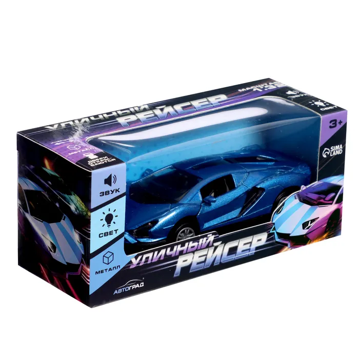 Машинка металлическая «Уличный рейсер», инерционная, 1:32, открываются двери, звуковые и световые эффекты, цвет синий — Характеристики