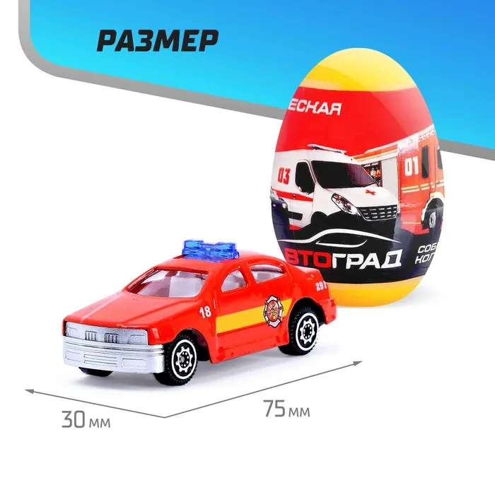 Собери свою коллекцию спецтехники! Металлическая машинка в яйце «Спецслужбы» – это миниатюрная модель в масштабе 1:64, которая станет началом захватывающего путешествия в мир экстренных служб. Каждое яйцо скрывает одну уникальную машинку: от полицейских автомобилей до спасательных грузовиков.