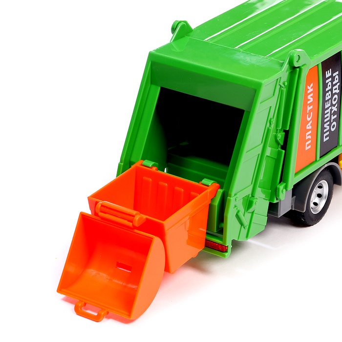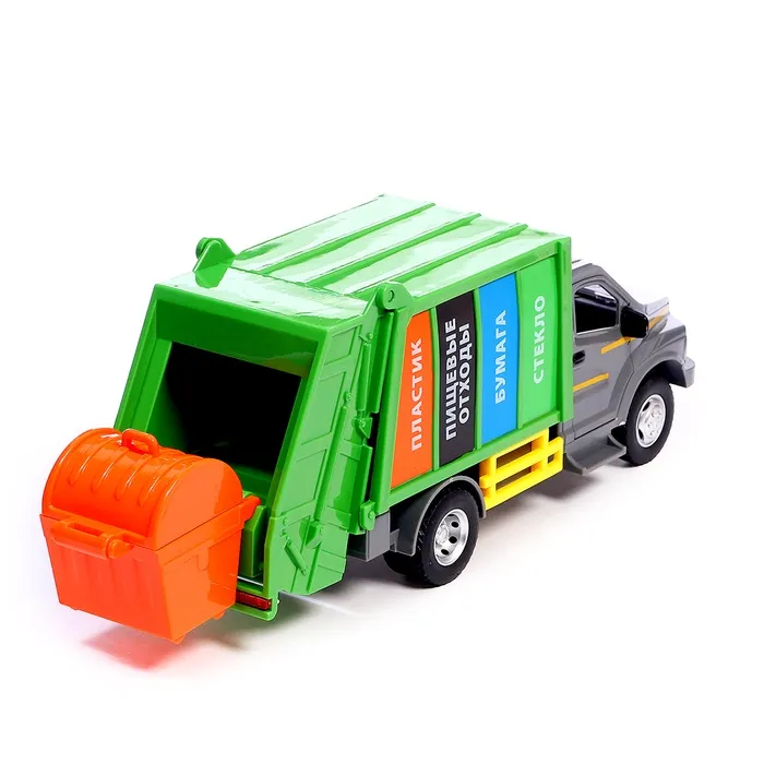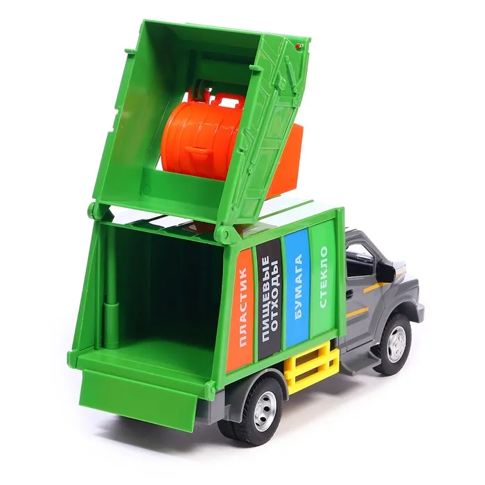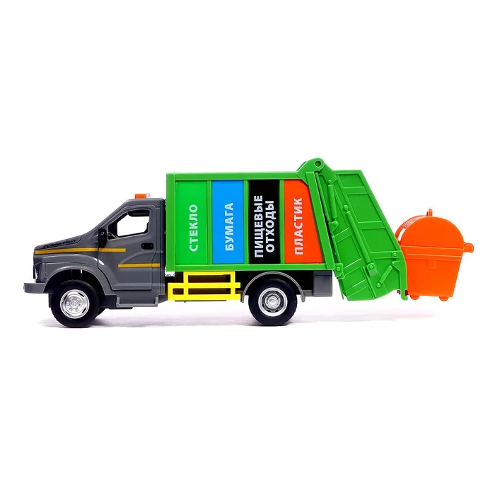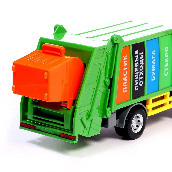 - Дизайн: Яркий зелёный кузов с надписями «Стекло», «Бумага», «Пищевые отходы» и «Пластик» — всё для обучения сортировке мусора.