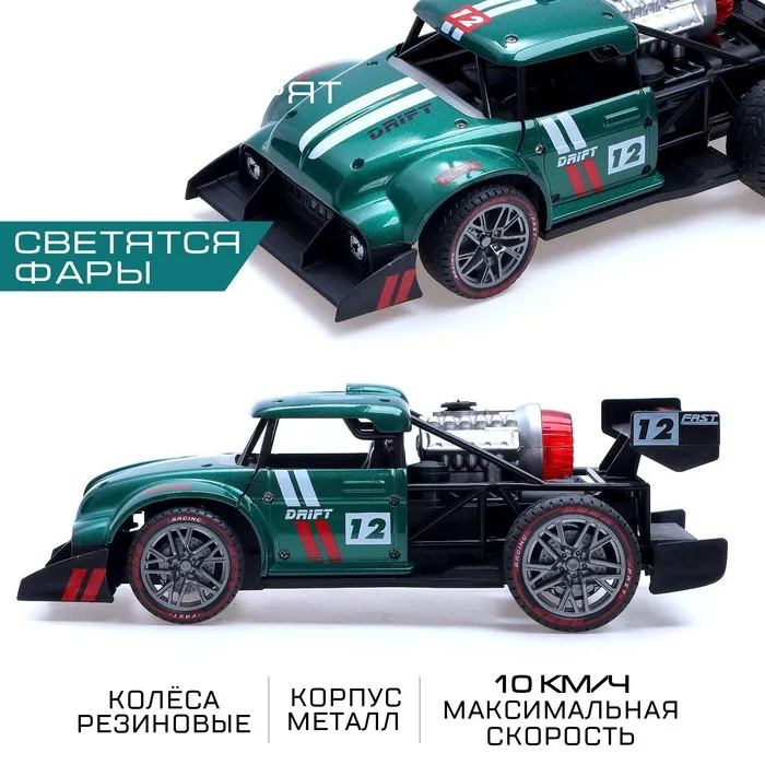 - Полное погружение в гонки: светящиеся фары и громкий звук работающего двигателя сопровождают каждую поездку. Машинка реагирует на команды с пульта резким ревом мотора.