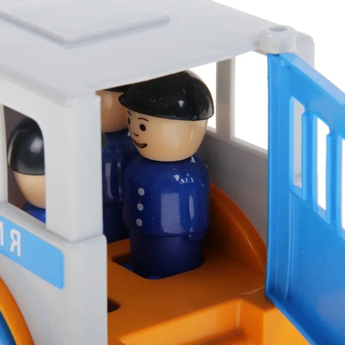 - Детализированный салон: в комплект входят фигурки сотрудников полиции, которых можно разместить в салоне машины. Фигурки выполнены с улыбчивыми лицами, что придает игрушке доброжелательность.