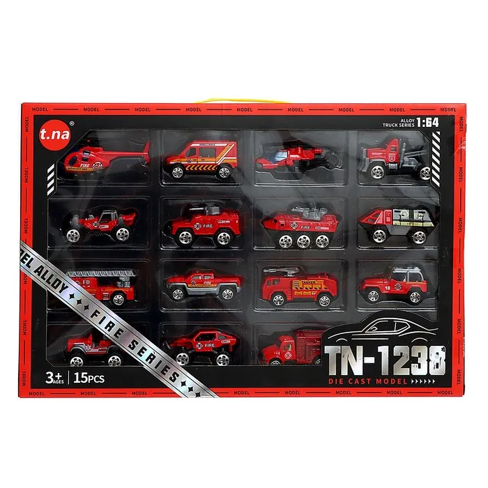 - 15 видов техники: в наборе представлены разнообразные модели пожарной техники: грузовики, автолестницы, автоцистерны и другие машины. Каждая модель выполнена в ярком красном цвете и отличается детализированным дизайном.