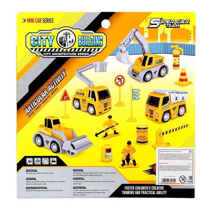 С этим набором ребёнок сможет развивать воображение, моделируя различные строительные процессы. Игрок научится планировать действия и координировать работу всей строительной команды. Фрикционные машины помогут улучшить моторику и точность движений. Теперь каждая комната может превратиться в оживлённую стройплощадку!