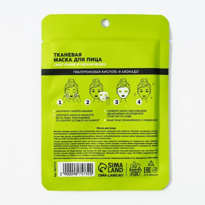 Маска для лица Avokado, 1 шт., тканевая с гиалуроновой кислотой, PICO MICO — Характеристики