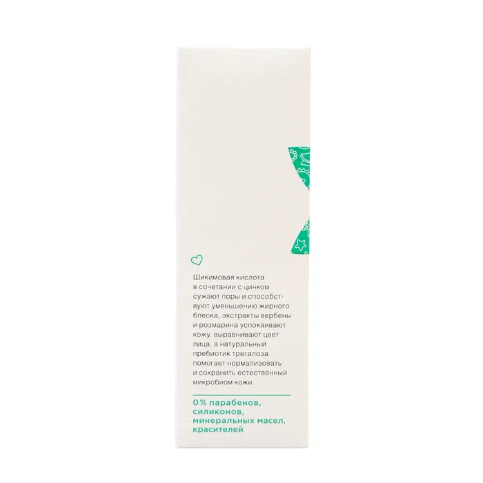 Шикимовая кислота в сочетании с цинком сужают поры и способствуют уменьшению жирного блеска, экстракты вербены и розмарина успокаивают кожу, выравнивают цвет лица, а натуральный пребиотик трегалоза помогает нормализовать и сохранить естественный микробиом кожи.