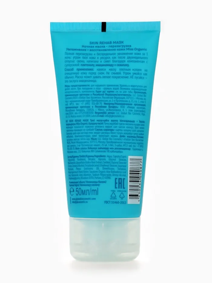 Маска для лица, ночная перезагрузка Skin rehab mask, увлажнение и сияние кожи, 50 мл, Miss Organic — Характеристики