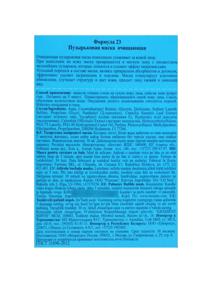 Способ применения: нанести тонким слоем на сухую кожу лица, избегая зоны вокруг глаз. Оставить на 5 минут. Помассировать образовавшейся пеной кожу лица. Смыть обильным количеством воды.