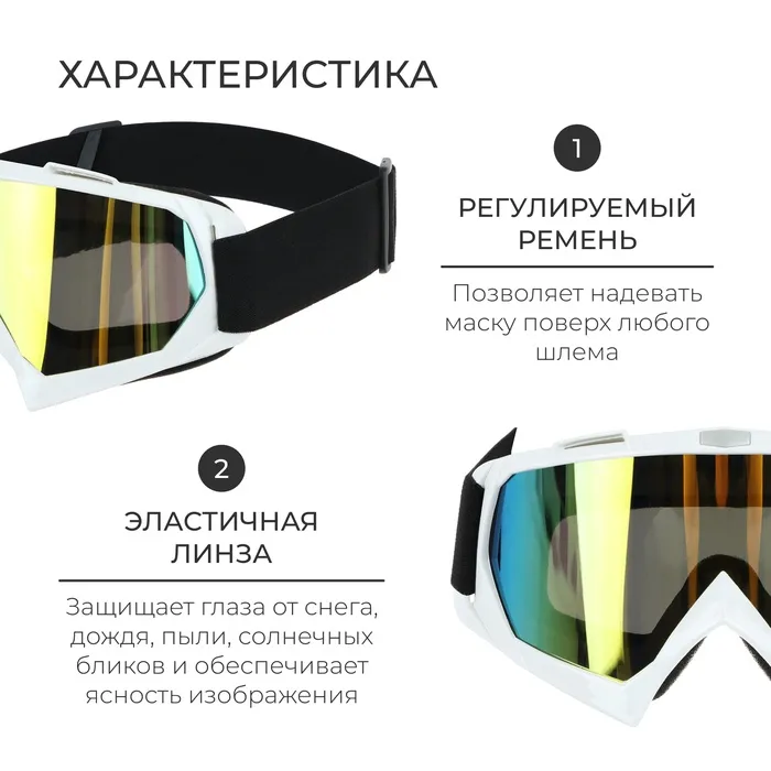 Горнолыжная маска — отличный выбор для тех, кто любит активный отдых в холодную зимнюю пору. Снаряжение предназначено для катания на горных лыжах, сноуборде и снегоходе. Эластичная линза защищает глаза от снега, дождя, пыли, солнечных бликов и обеспечивает ясность изображения. Универсальный размер и регулируемый ремень позволяют надевать маску поверх любого шлема.