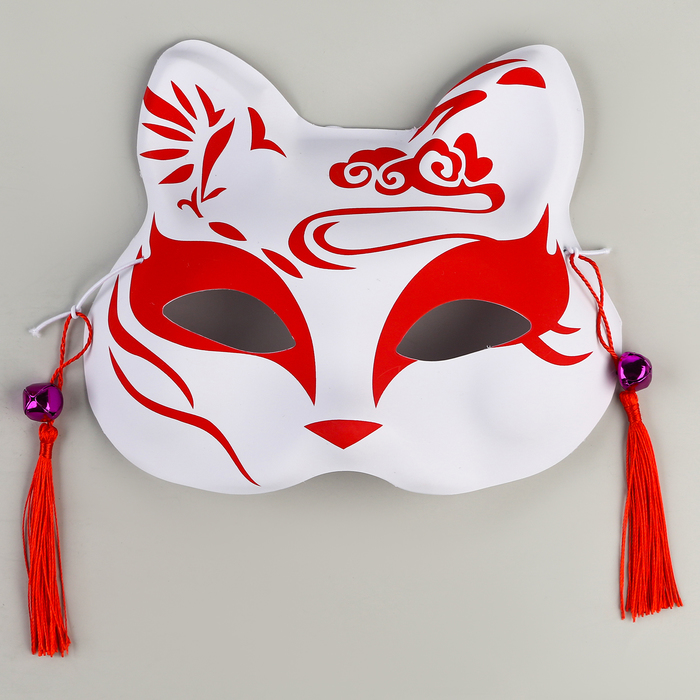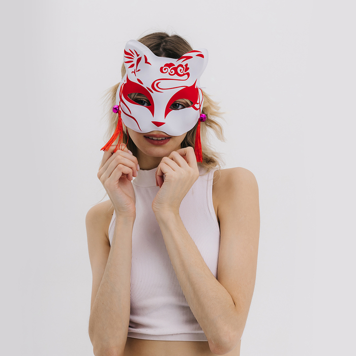 Познакомьтесь с карнавальной маской «Кицунэ» красно-белого цвета, которая воплощает дух японского искусства. Эта маска, украшенная изящными подвесками, станет выразительным акцентом вашего костюма и привлечёт внимание на любом мероприятии.
