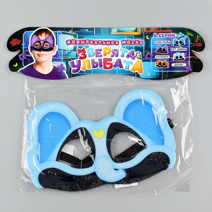 Карнавальная маска «Зверята улыбата. Слон Буби» — это милый и оригинальный аксессуар для любого праздника. Маска выполнена из мягкого фетра голубых оттенков и украшена забавной мордочкой слоника. Она надежно фиксируется на голове с помощью резинки.