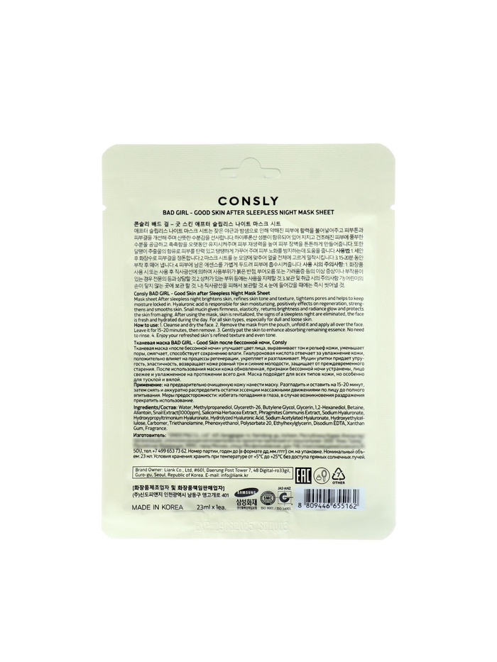 Тканевая маска «после бессонной ночи» улучшает цвет лица, выравнивает тон и рельеф кожи, уменьшает поры, смягчает, способствует сохранению влаги. Гиалуроновая кислота отвечает за увлажнение кожи, положительно влияет на процессы регенерации, укрепляет и разглаживает. Муцин улитки придает упругость, эластичность, возвращает коже ровный тон и сияние молодости, защищает от преждевременного старения. После использования маски кожа обновленная, признаки бессонной ночи устранены, лицо свежее и увлажненное на протяжении всего дня. Маска подойдет для всех типов кожи, но особенно для тусклой и вялой.