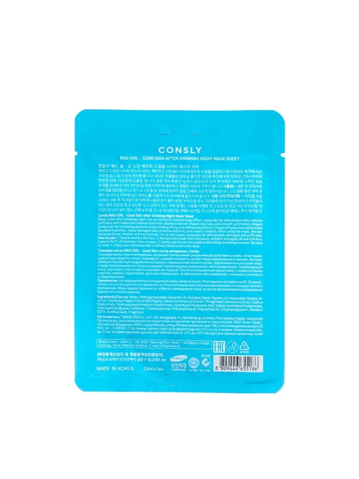 Тканевая маска «после вечеринки» оказывает интенсивное увлажняющее действие на кожу, испытывающую острую нехватку влаги, тонизирует, снимает отечность, делает лицо отдохнувшим и свежим. Экстракт бамбука способствует выработке коллагена, повышая эластичность кожи, подтягивая ее и улучшая тонус. 4 вида гиалуроновой кислоты оказывают превосходное увлажнение, восстанавливают поврежденную кожу, улучшают эластичность и делают ее гладкой. После использования маски кожа становится более упругой, свежей, подтянутой. Для всех типов кожи, особенно для обезвоженной, склонной к отечности и поврежденной.