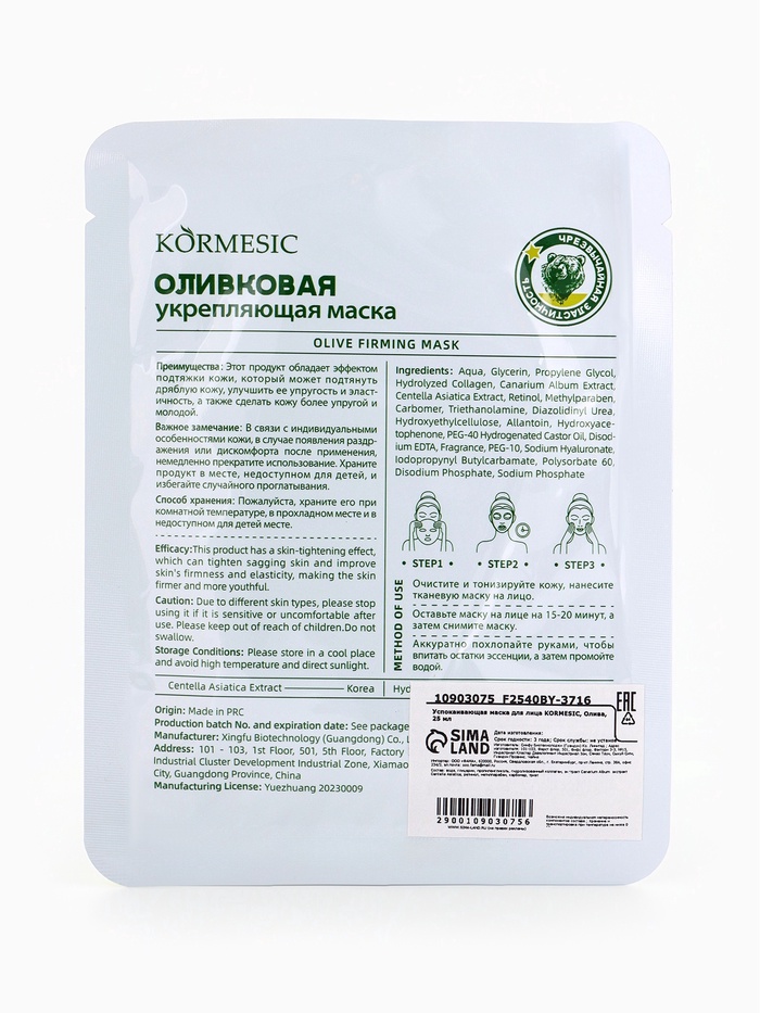 Маска тканевая для лица KORMESIC «Олива», успокаивающая, 25 мл — Характеристики