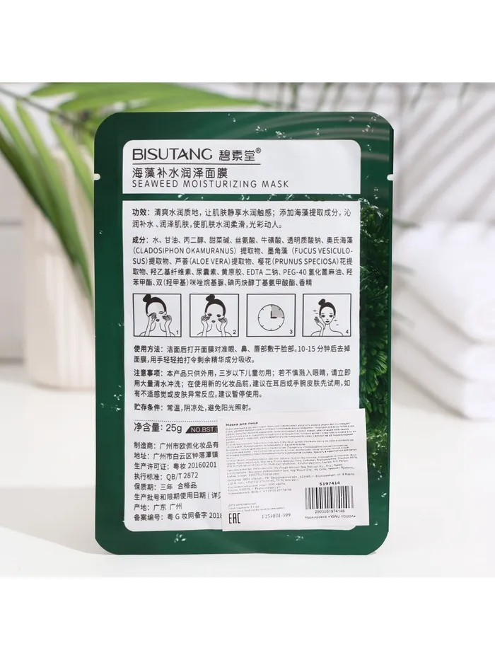 Отбеливающая и увлажняющая маска восстанавливает упругость кожи и укрепляет её, очищает поры, удаляет пигментацию и обладает омолаживающим эффектом. Подходит для всех типов кожи. Эффективность: морские водоросли легко впитываются сухой кожей, обеспечивая её большим количеством влаги, содержат натуральные ингредиенты, которые делают кожу эластичной и в то же время мягкой и сияющей, удерживают влагу на поверхности кожи и влияют на её гидролипидный баланс.