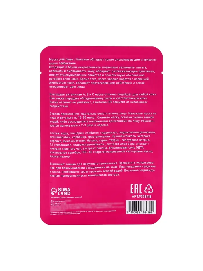Способ применения: тщательно очистите кожу лица. Наложите маску на лицо и оставьте на 15-20 минут. Снимите маску, остатки смойте тёплой водой, либо распределите массажными движениями по лицу. Рекомендуется использовать 2-3 раза в неделю.