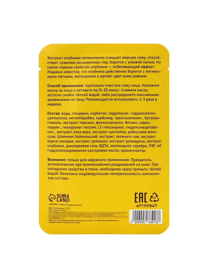 Способ применения: тщательно очистите кожу лица. Наложите маску на лицо и оставьте на 15-20 минут. Снимите маску, остатки смойте тёплой водой, либо распределите массажными движениями по лицу. Рекомендуется использовать 2-3 раза в неделю.