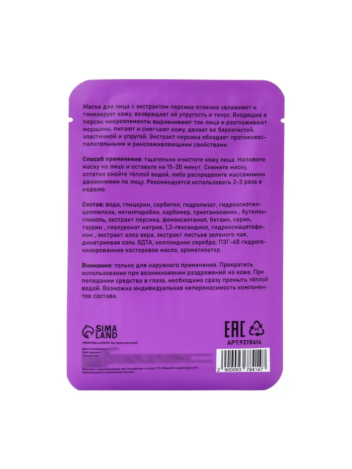 Способ применения: тщательно очистите кожу лица. Наложите маску на лицо и оставьте на 15-20 минут. Снимите маску, остатки смойте тёплой водой, либо распределите массажными движениями по лицу. Рекомендуется использовать 2-3 раза в неделю.