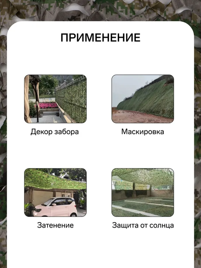Эта камуфляжная сетка идеально подходит для создания закрытых пространств на вашем участке. Используйте ее для декорирования заборов, создания укрытий или для маскировки неэстетичных объектов.