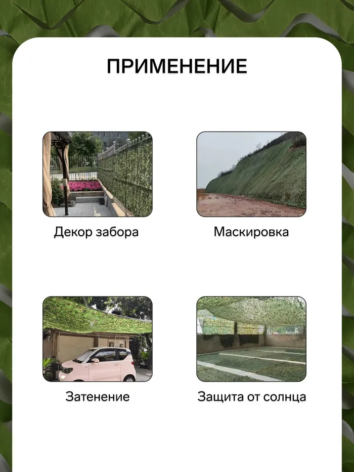 Эта камуфляжная сетка идеально подходит для создания закрытых пространств на вашем участке. Используйте ее для декорирования заборов, создания укрытий или для маскировки неэстетичных объектов.