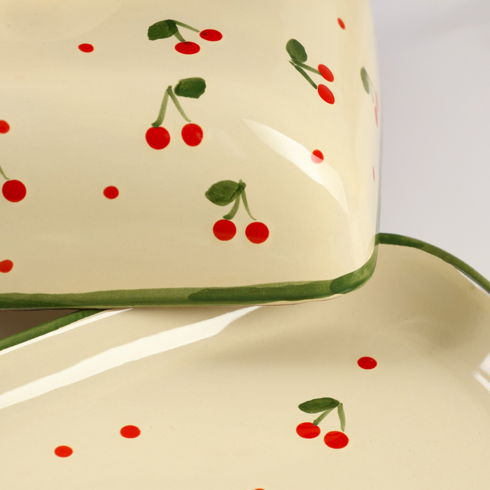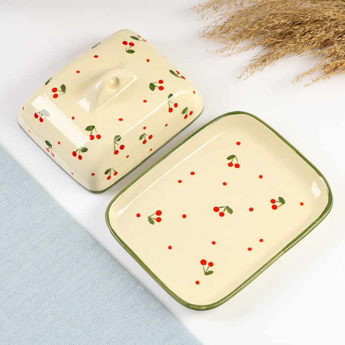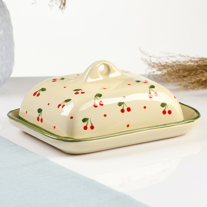 Керамическая маслёнка в нежном бежевом цвете — идеальное решение для хранения и подачи масла. Размеры 18×14×8 см позволяют удобно разместить её на вашем столе, а стильный дизайн с ягодным рисунком добавит уют в каждую трапезу.