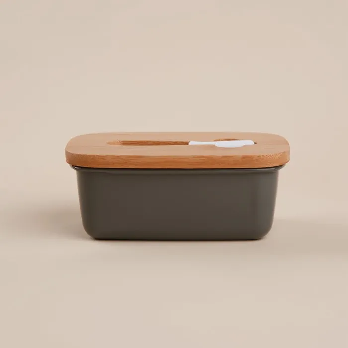 Маслёнка выполнена из прочной оцинкованной стали, что гарантирует её долговечность и стойкость к повреждениям. Крышка из натурального бамбука добавляет природного тепла и гармонии, а также надежно защищает масло от посторонних запахов и пыли. Прямоугольная форма изделия идеально подходит для хранения стандартных пачек масла, обеспечивая легкий доступ и экономию места в холодильнике.
